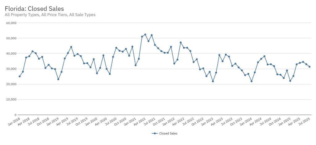 In July 2025, Florida reported 31,354 closed sales transactions, representing a 4.9% decline from the previous year.