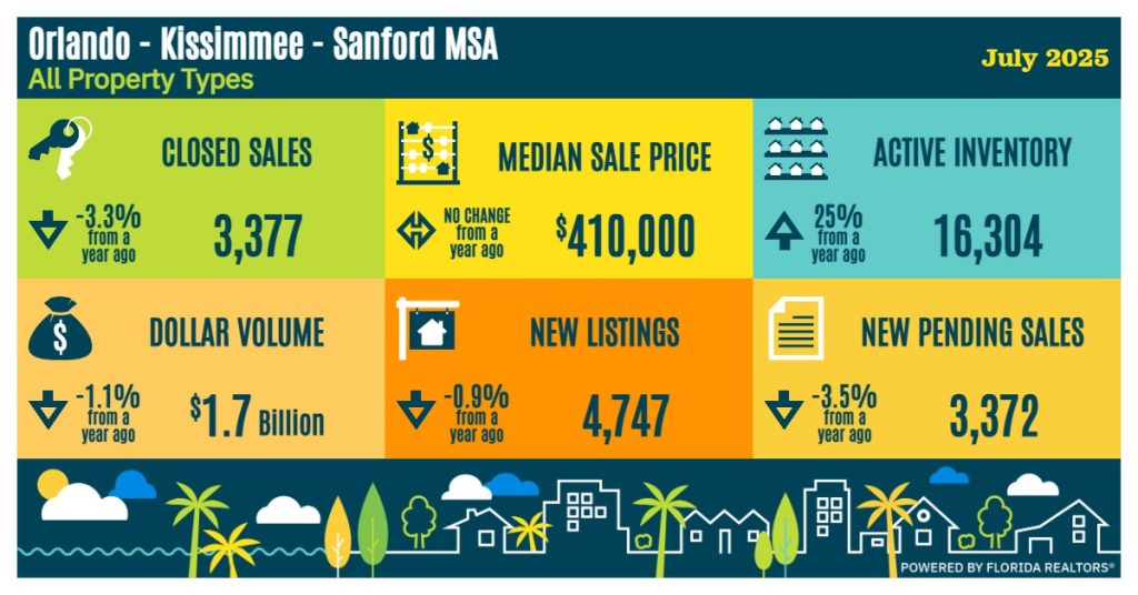 In July 2025, Orlando’s existing home sales fell 3.3% year-over-year to 3,377 closed transactions, while total sales volume slipped 1.1% to $1.7 billion.