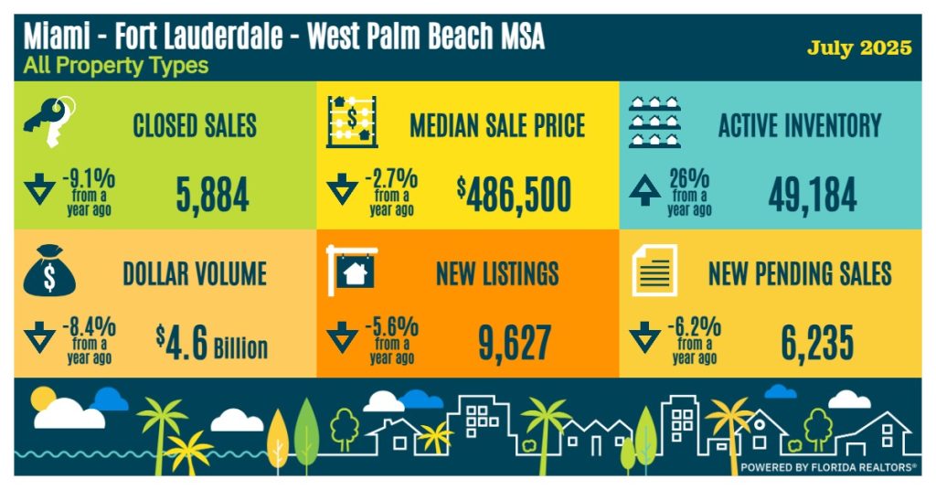 As of July 2025, South Florida’s housing market extended its trend of slowing sales activity and softening prices. Closed sales declined 9.1% year-over-year to 5,884 units, while the total dollar volume fell 8.4% to $4.6 billion. At the same time, the median price across all property types slipped 2.7% to $486,500.