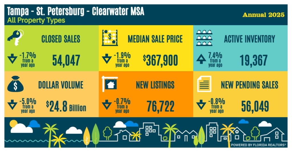 The Tampa-St. Petersburg-Clearwater metro area housing market in 2025 exemplified the broader “housing reset,” moving away from the overheated post-pandemic frenzy toward greater stability and balance as supply expanded and pricing pressures eased.